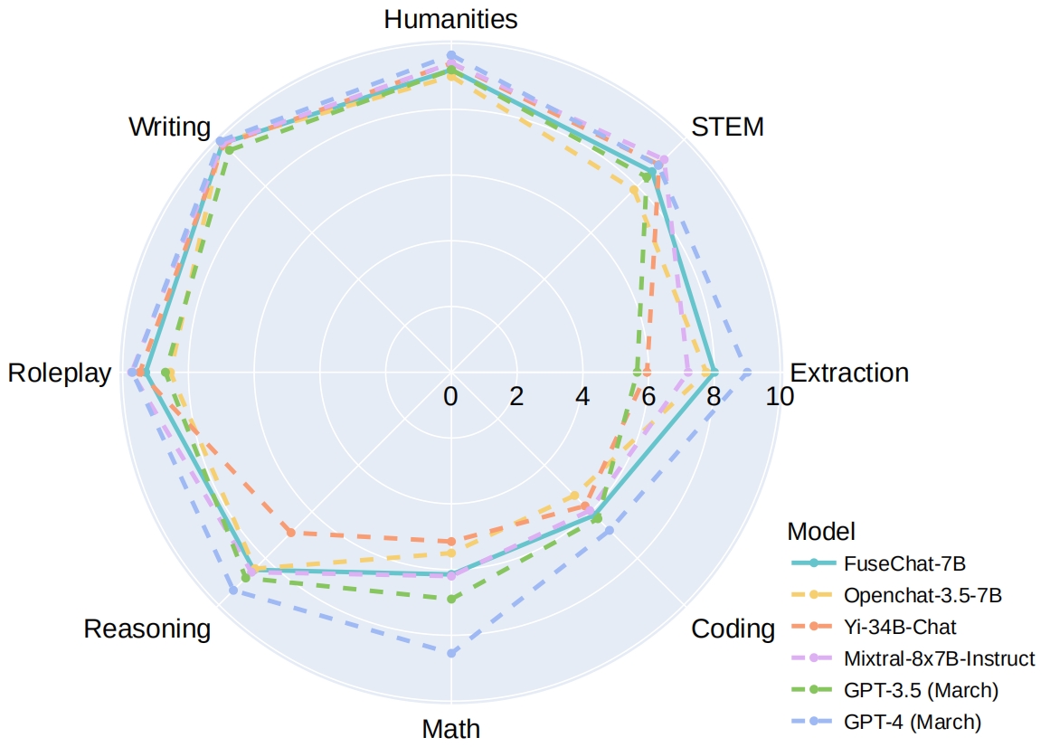 Feb 26, 2024: 🔥🔥 We release FuseChat-7B-VaRM, which is the fusion of three prominent chat LLMs with diverse architectures and scales, namely NH2-Mixtral-8x7B, NH2-Solar-10.7B, and OpenChat-3.5-7B. FuseChat-7B-VaRM achieves an average performance of 8.22 on MT-Bench, outperforming various powerful chat LLMs at 7B and 34B scales like Starling-7B and Yi-34B-Chat, even surpassing GPT-3.5 (March), Claude-2.1, and approaching Mixtral-8x7B-Instruct.