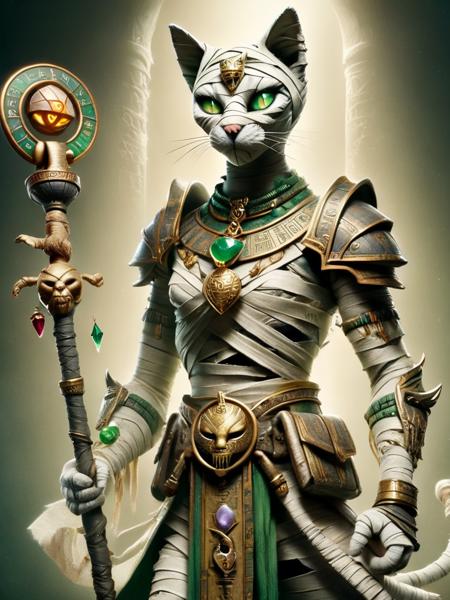 - bastet, cat, a female bastet with heavy shoulder armor plates, green eyes, magical staff in right hand, belt with animal head, gem stone on the chest, magic staff, mummy style