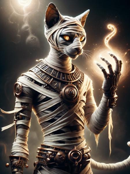 - bastet, cat, a male bastet, man, dressed as a mummy, casting a glowing magic spell in his hand, wearing retropunk machinery on his body,