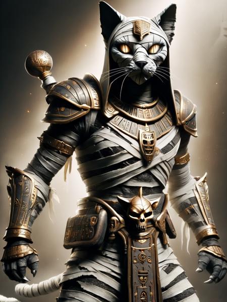 - bastet, cat, a male bastete in a bandages, mummy, holding a magic statt with symbols in it, spiked shoulder plates, glowing white eyes, leather belt on chest, staff on the back