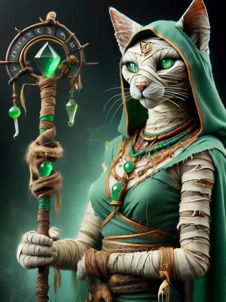 - a bastet female cat, shaman, wizzard, sorcerer, with staff, holding staff, green eyes,