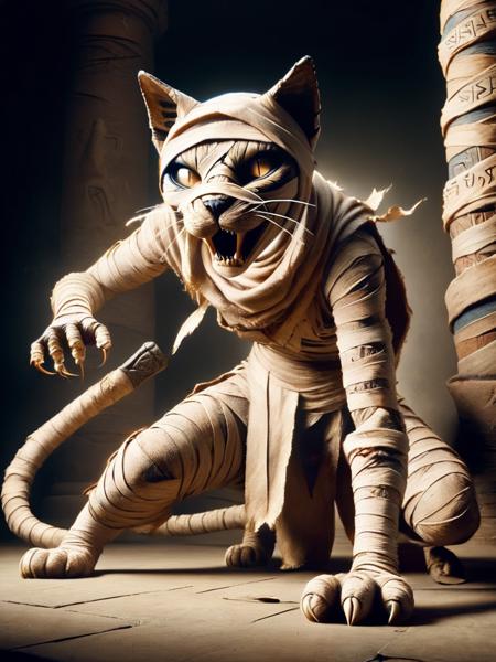 - bastet, a cat dressed in armor, writst armor, shoulder plates, shoulder armor, chest armor, black and bronze armor with runes, wrapped in bondages, mummy style, glowing eyes, fighting pose