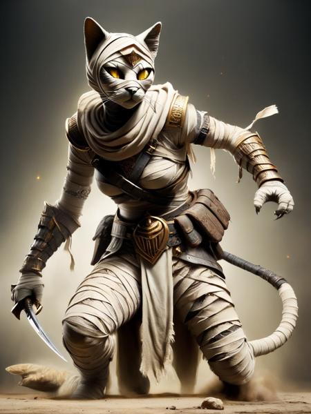 - text: 'bastet, a man in a costume with a knife in his left hand, mummy style, claws, kneeling on the floor, attack pose, mummy style, wrapped in bandages '