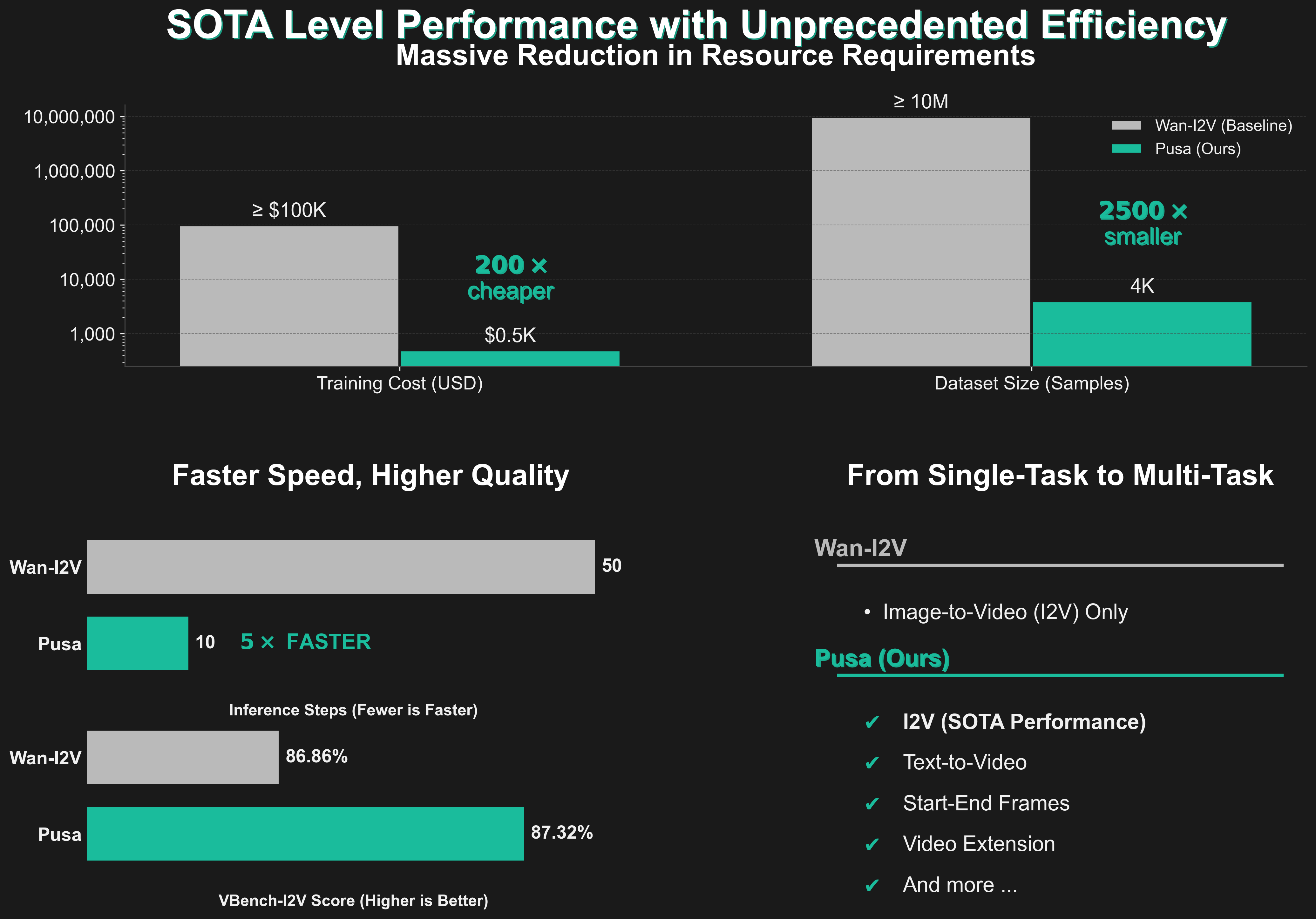 Pusa not only sets a new standard for image-to-video (I2V) generation but also unlocks many zero-shot multi-task capabilities such as start-end frames and video extensionβall without task-specific training. Meanwhile, Pusa can still perform text-to-video generation. This work establishes a scalable, efficient, and versatile paradigm for next-generation video synthesis, democratizing high-fidelity video generation for research and industry alike.