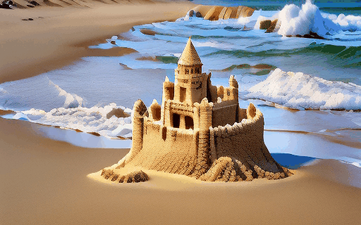 | A quiet beach at dawn and the waves gently lapping. | A cute teddy bear, dressed in a red silk outfit, stands in a vibrant street, Chinese New Year. | A sandcastle being eroded by the incoming tide. | An astronaut flying in space, in cyberpunk style. |
