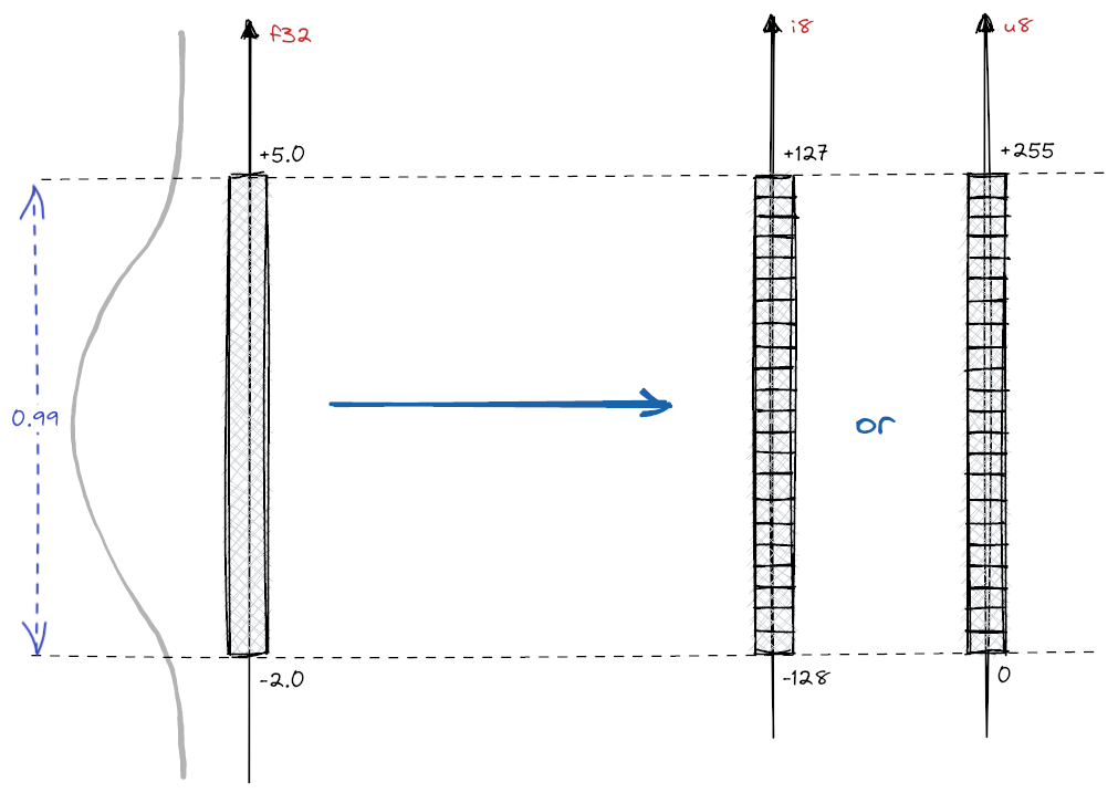 We use a scalar quantization process to convert the float32 embeddings into int8. This involves mapping the continuous range of float32 values to the discrete set of int8 values, which can represent 256 distinct levels (from -128 to 127), as shown in the image below. This is done by using a large calibration dataset of embeddings. We compute the range of these embeddings, i.e., the min and max of each embedding dimension. From there, we calculate the steps (buckets) to categorize each value.