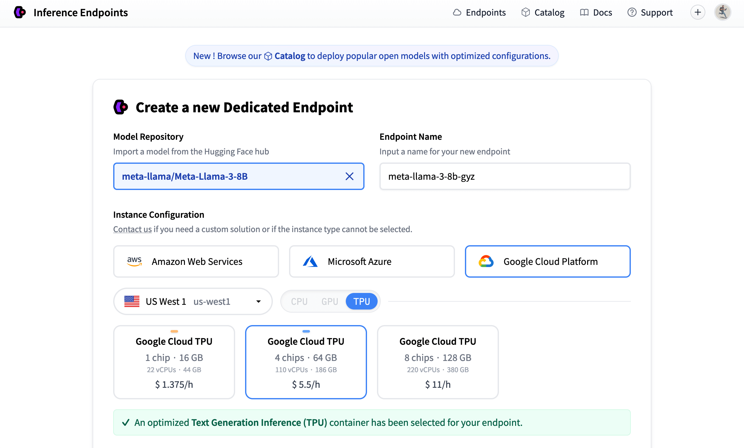 Hugging Face Inference Endpoints provides a seamless way to deploy Generative AI models with a few clicks on a dedicated, managed infrastructure using the cloud provider of your choice. Starting today, Google TPU v5e is available on Inference Endpoints. Choose the model you want to deploy, select Google Cloud Platform, select us-west1 and you’re ready to pick a TPU configuration: