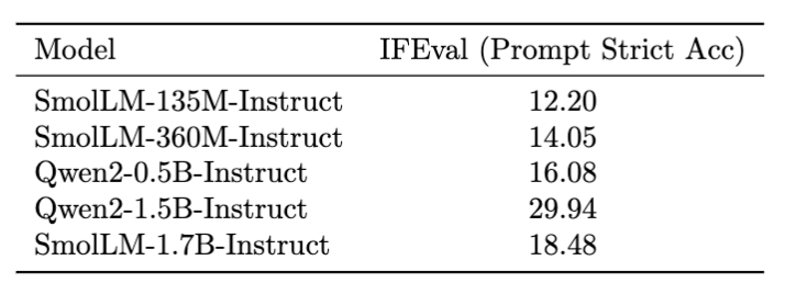 下表展示了经指令精调的 SmolLM 模型 (SmolLM-Instruct) 和其它模型在 IFEval 上的对比。Qwen2-1.5B-Instruct 取得了最高分,SmolLM-Instruct 模型则在模型大小和性能上取得了很好的权衡,而且仅使用了公开可用的数据集。