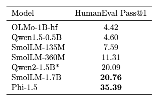 - SmolLM-1.7B 还在 Python 编程能力上表现抢眼 (我们测评的 Qwen2-1.5B 分数和 Qwen 团队给出的不同,我们的实验配置是: temperature 设为 0.2,top-p 设为 0.95,样本量为 20)。