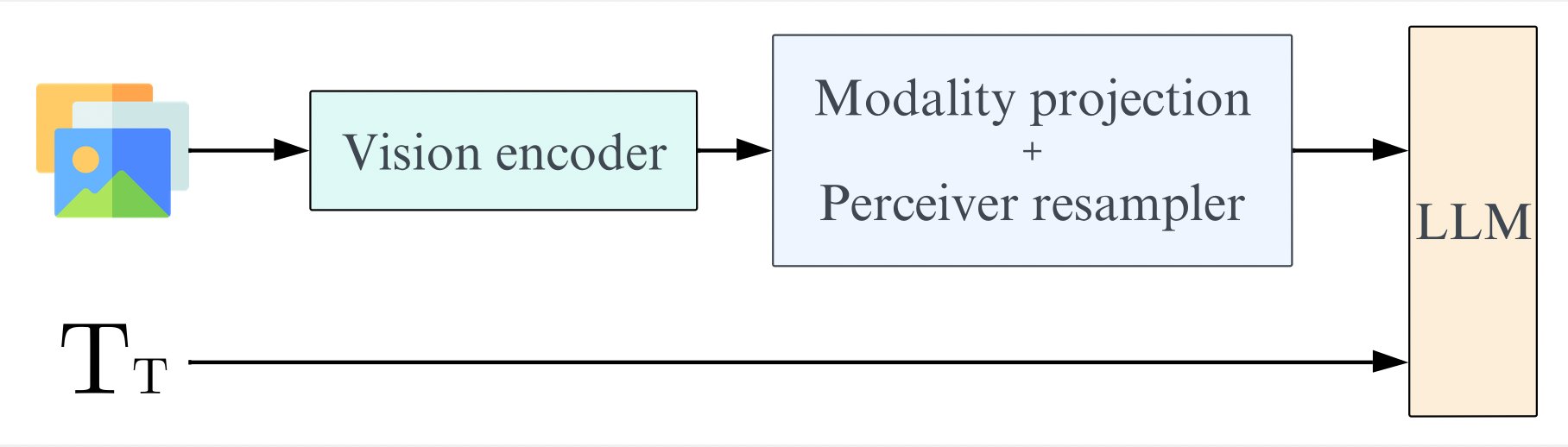 For Idefics2, we adopted a simple architecture: -Images are fed to a vision encoder, then to a modality projection to match the input dimension of the LLM, and finally to a perceiver resampler for efficient pooling. -Interleaved image-text data are then passed to the LLM.