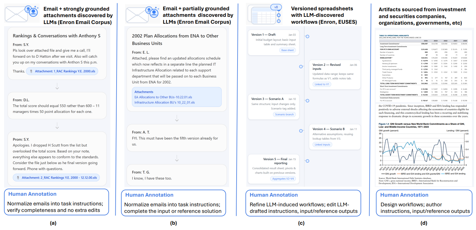 - Deriving concrete workflow instances by analyzing changes across spreadsheet versions (15,000 versioned spreadsheet files from Enron and EUSES) and designing workflows based on high-quality recent artifacts from investment and securities companies, World Bank, Canadian/British government agencies, WideSearch, Dabstep, and more.