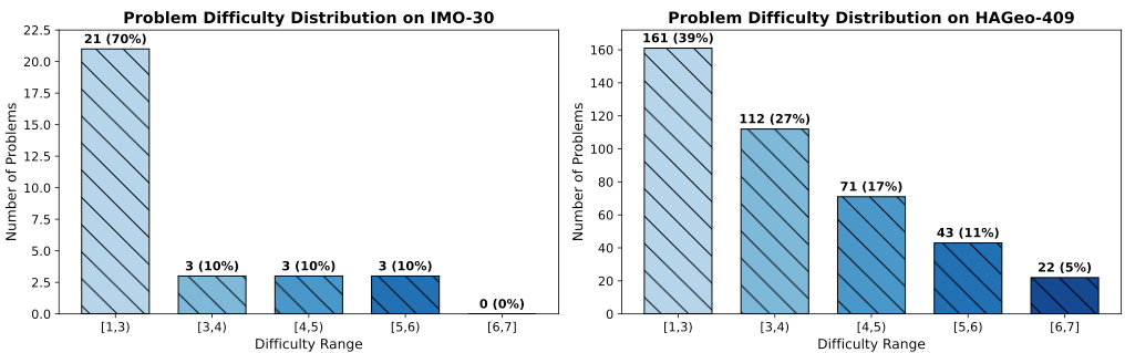 Figure 1: Problem difficulity distribution of the IMO-30 benchmark and our new HAGeo-409 benchmark.