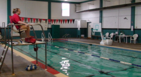 A lifeguard is seated on a lifeguard chair at the edge of a swimming pool. The pool has blue lanes marked with white lines. There are several pool chairs and a table with a bottle on it near the pool area. The walls of the room are painted in shades of green and white, and there are flags hanging from the ceiling. The floor appears to be tiled, and there are some pool equipment items on the floor near the lifeguard chair.