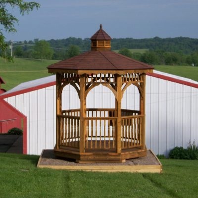 A wooden gazebo with a red roof stands in a grassy field with a barn in the background.