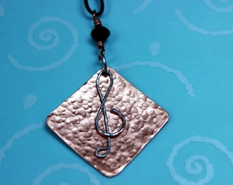 A silver pendant with a musical note design is hanging from a black cord against a blue background with swirling patterns.