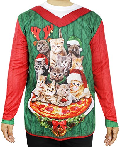 Faux Real Ugly Christmas Sweater - Xmas Cats & Pizza Long Sleeve Mens T-Shirt - Size - Funny Xmas Outfits