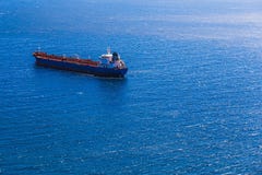 A large blue cargo ship is sailing on the open ocean with calm waves and a clear sky.