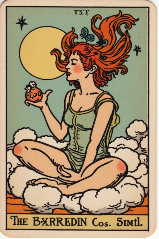 a trtcrd of a young woman sitting cross-legged on a floating cloud, eyes closed in meditation, with butterflies made of starlight circling her head, holding a crystal orb that shows swirling galaxies inside, her hair flowing upward like smoke, "the dreamer"
