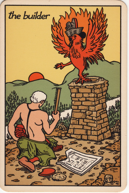a trtcrd of a strong figure in work clothes kneeling beside a half-built stone tower, hammer in hand, with blueprints scattered around, a phoenix rising from forge flames in the background, mountains silhouetted against dawn, "the builder"