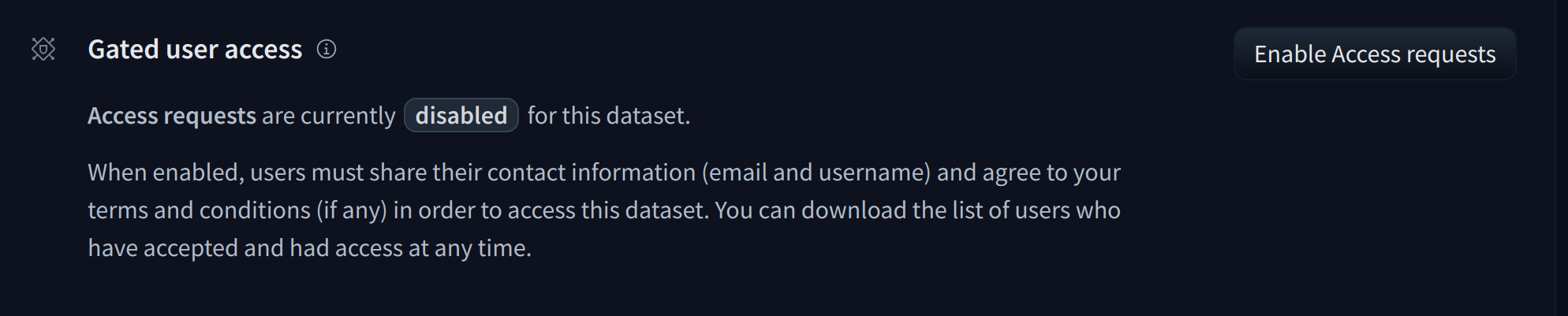 To enable access requests, go to the dataset settings page. By default, the dataset is not gated. Click on Enable Access request in the top-right corner.