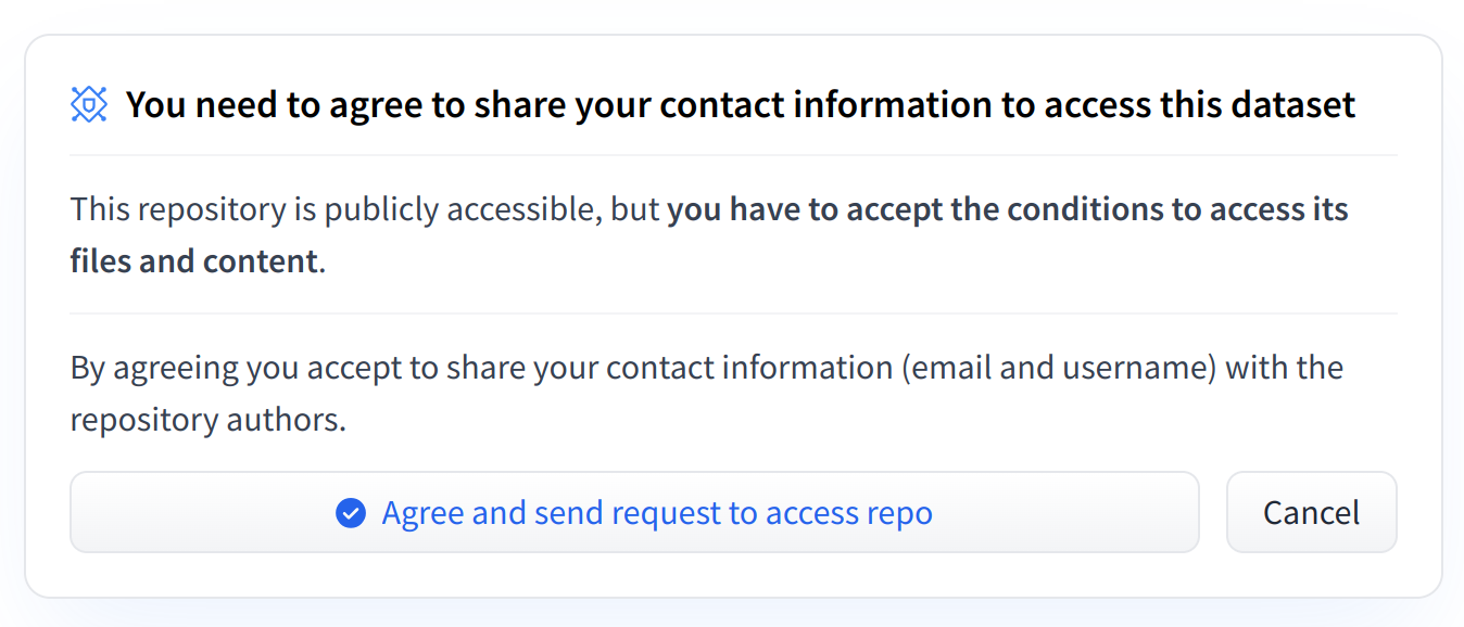 By default, users landing on your gated dataset will be asked to share their contact information (email and username) by clicking the Agree and send request to access repo button.