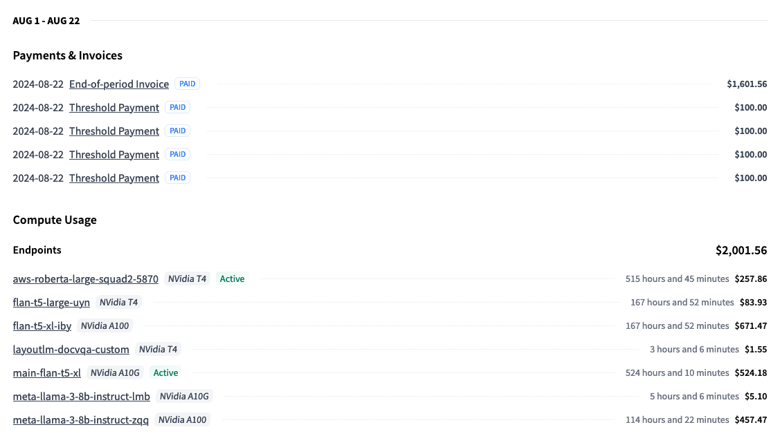 Compute services usage is billed separately from PRO and Enterprise Hub subscriptions (and potential private storage). Invoices for compute services are edited at the beginning of each month.