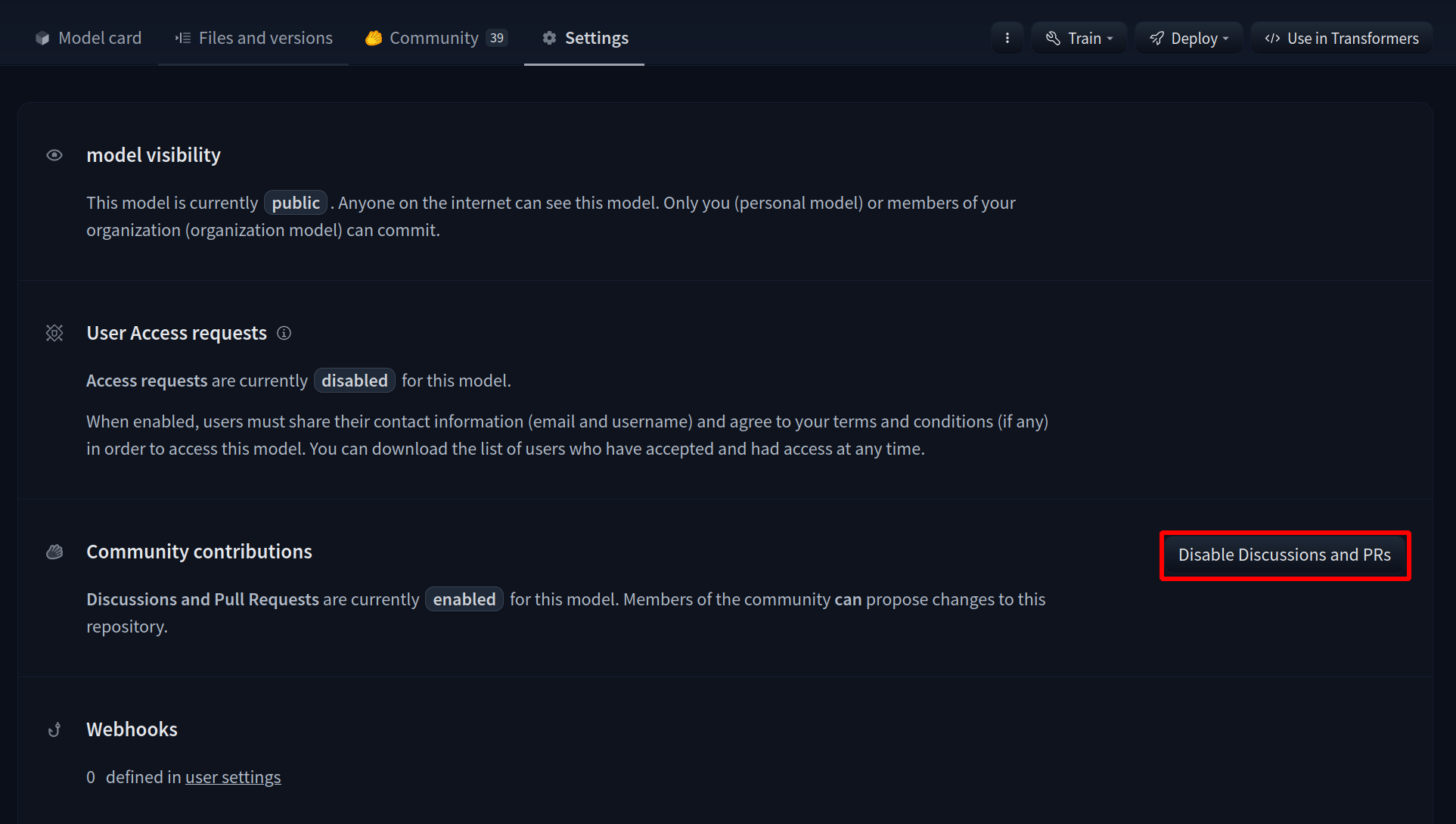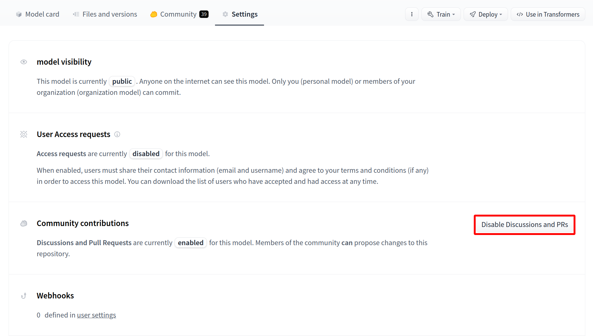 You can disable all discussions and Pull Requests. Once disabled, all community and contribution features won’t be available anymore. This action can be reverted without losing any previous discussions or Pull Requests.