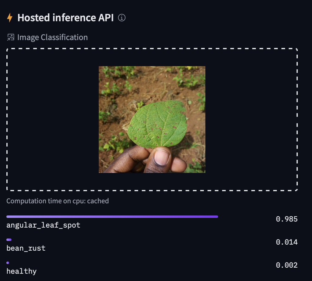 # [{"label":"angular_leaf_spot","score":0.9845947027206421},{"label":"bean_rust","score":0.01368315052241087},{"label":"healthy","score":0.001722085871733725}]Additional resources