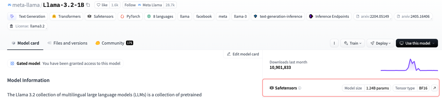 • The model.safetensors file stores the models pretrained layers and weights. For large models, the safetensors file is sharded to limit the amount of memory required to load it. Browse the model.safetensors.index.json file to see which safetensors file the model weights are being loaded from.