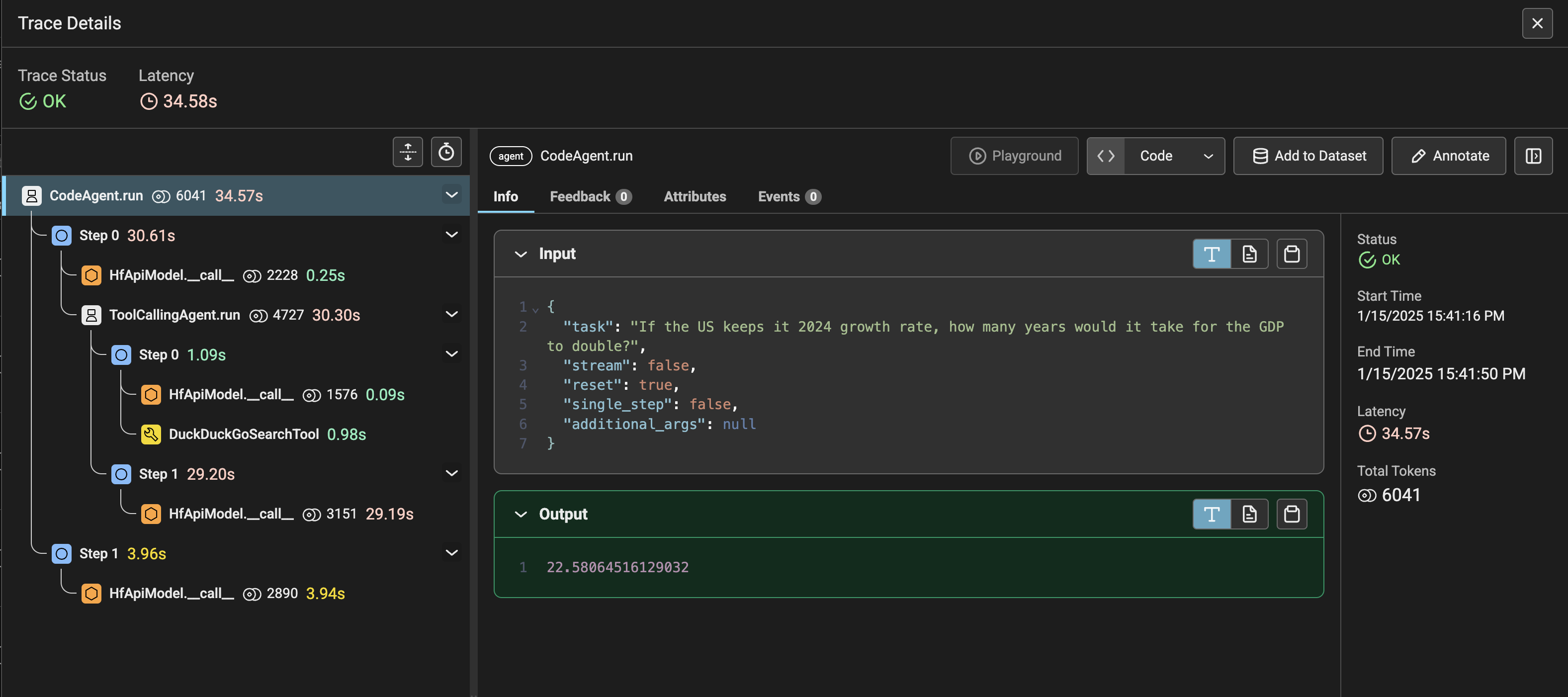 आप देख सकते हैं कि CodeAgent ने अपने मैनेज्ड ToolCallingAgent को (वैसे, मैनेज्ड एजेंट एक CodeAgent भी हो सकता था) U.S. 2024 ग्रोथ रेट के लिए वेब सर्च चलाने के लिए कॉल किया। फिर मैनेज्ड एजेंट ने अपनी रिपोर्ट लौटाई और मैनेजर एजेंट ने अर्थव्यवस्था के दोगुना होने का समय गणना करने के लिए उस पर कार्य किया! अच्छा है, है ना?