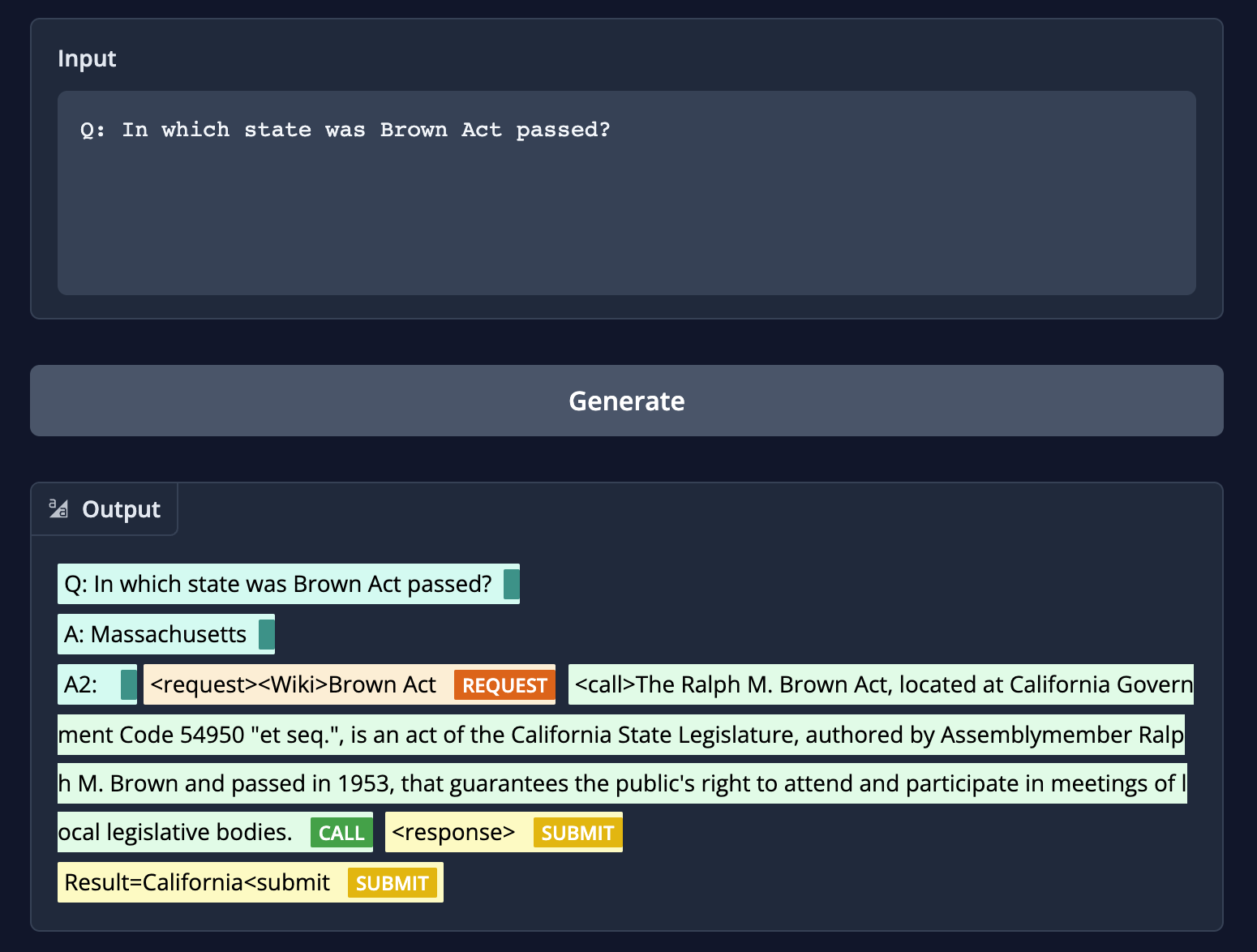 ToolFormer’s wiki tool returns “The Ralph M. Brown Act is an act of the California State Legislature that guarantees the public’s right to attend and participate in meetings of local legislative bodies.” which is more succinct.