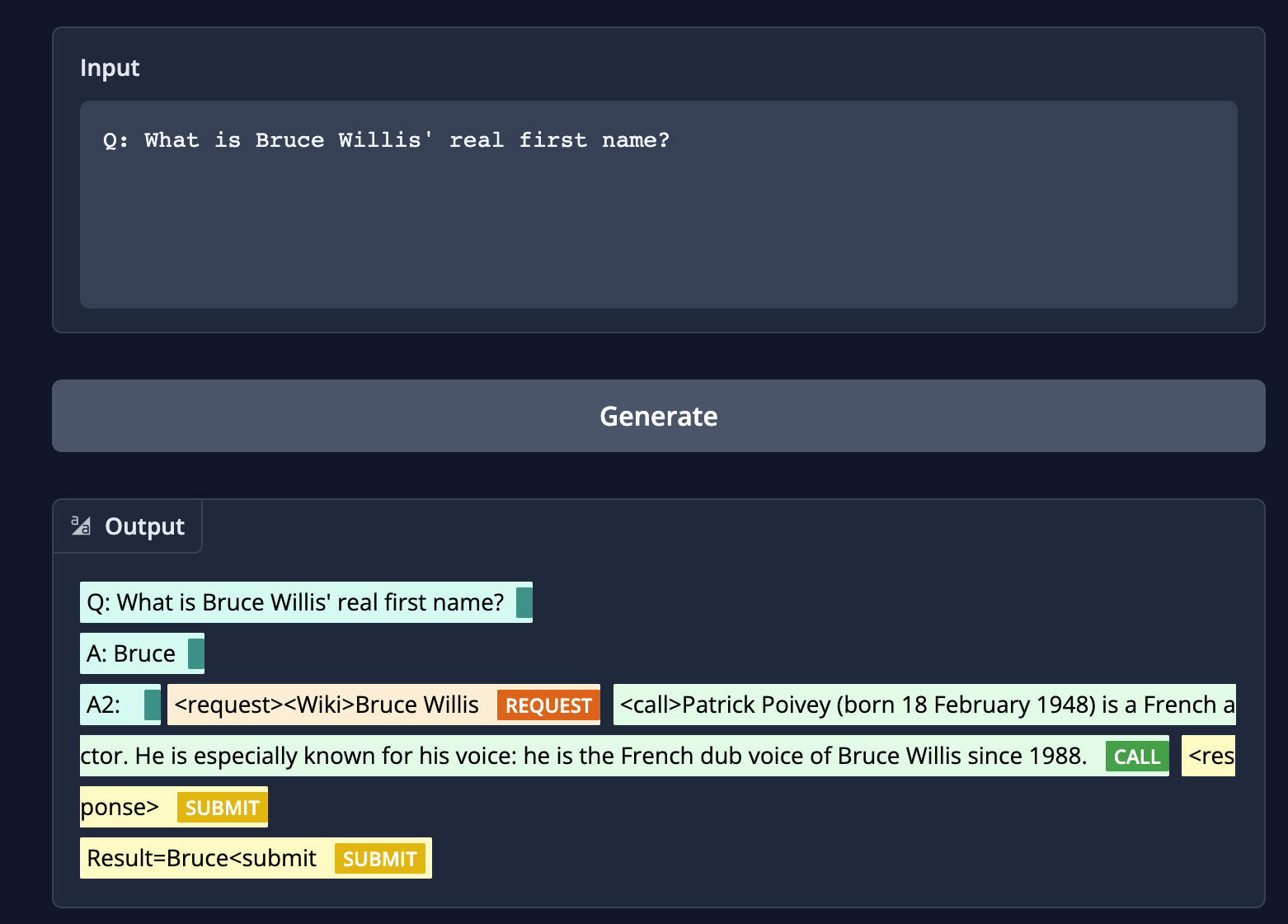 "What is Bruce Willis' real first name?"if the model searches forBruce Willis, our wiki tool returns “Patrick Poivey (born 18 February 1948) is a French actor. He is especially known for his voice: he is the French dub voice of Bruce Willis since 1988.But a correct search should beWalter Bruce Willis (born March 19, 1955) is an American former actor. He achieved fame with a leading role on the comedy-drama series Moonlighting (1985–1989) and appeared in over a hundred films, gaining recognition as an action hero after his portrayal of John McClane in the Die Hard franchise (1988–2013) and other roles.[1][2]”