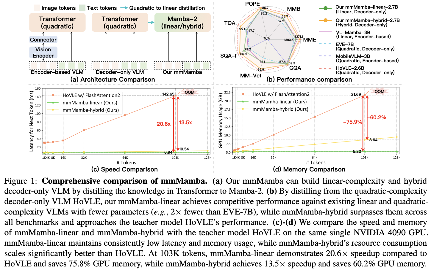 Distilled from the decoder-only HoVLE-2.6B, our pure Mamba-2-based mmMamba-linear achieves performance competitive with existing linear and quadratic-complexity VLMs, including those with 2x larger parameter size like EVE-7B. The hybrid variant, mmMamba-hybrid, further enhances performance across all benchmarks, approaching the capabilities of the teacher model HoVLE. In long-context scenarios with 103K tokens, mmMamba-linear demonstrates remarkable efficiency gains with a 20.6× speedup and 75.8% GPU memory reduction compared to HoVLE, while mmMamba-hybrid achieves a 13.5× speedup and 60.2% memory savings.