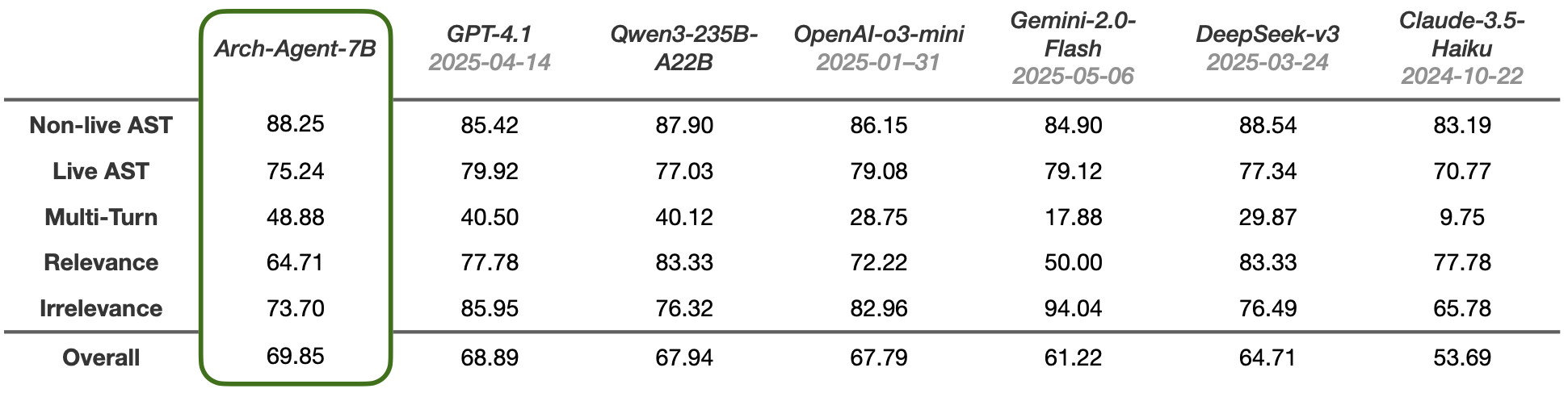 We evaluate Katanemo Arch-Agent series on the Berkeley Function-Calling Leaderboard (BFCL). We compare with commonly-used models and the results (as of June 14th, 2025) are shown below.