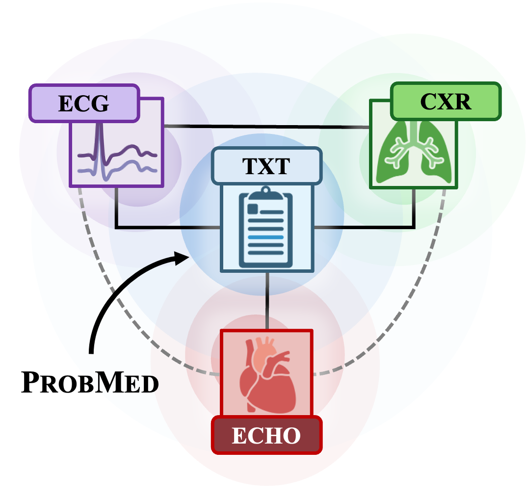 Probabilistic Modality-Enhanced Diagnosis (ProbMED), a multi-modal Med-VLPM that employs probabilistic contrastive learning to model distributions over embeddings rather than fixed-point, deterministic estimates. ProbMED aligns four distinct modalities—chest X-rays, electrocardiograms, echocardiograms, and clinical text—into a unified probabilistic embedding space.
