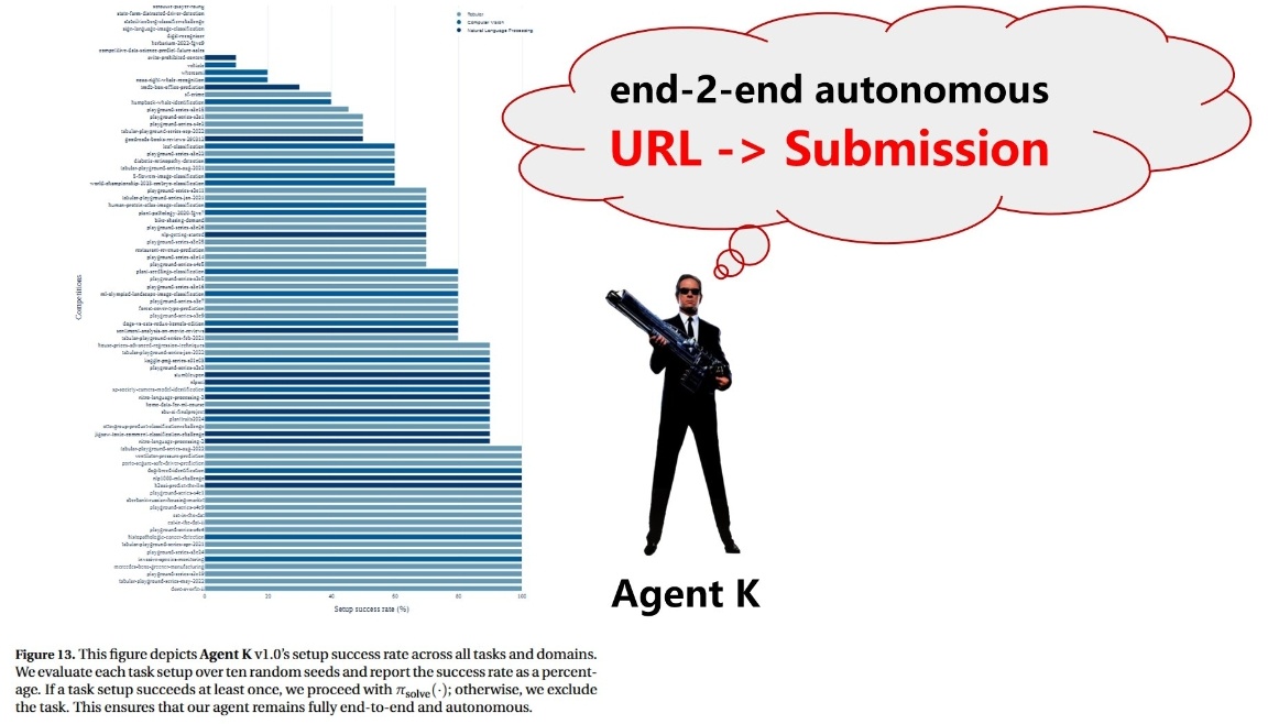 Agent K is the first end-to-end agent (i.e., autonomous from Kaggle URL to submissions that win competitions) to achieve an equivalent of Kaggle grandmaster level. Our agent codes the whole data science pipeline from a natural language description of the competition and raw data!