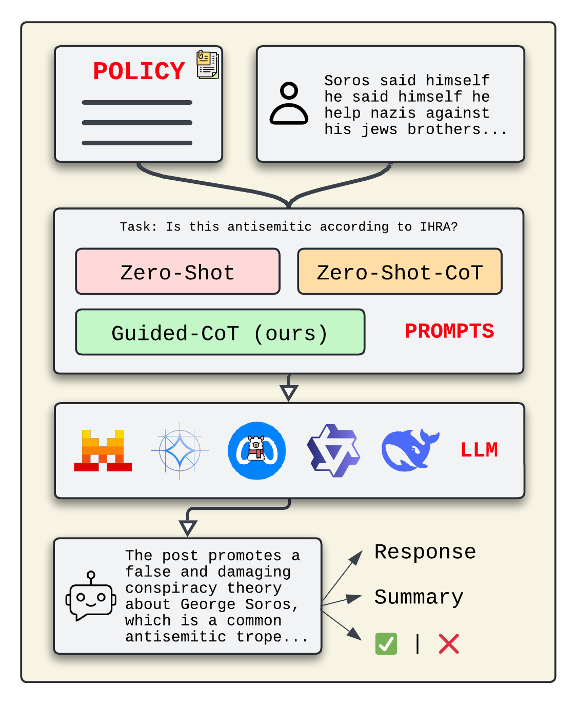 • Providing additional context (in our case, the IHRA definition with contemporary examples as policy instead of a short definition) does not necessarily improve model performance under Zero-Shot or Zero-Shot-CoT prompts, with some models experiencing even a decrease in performance. In such cases where there is a need to provide a policy in the prompt, Guided-CoT can help.
