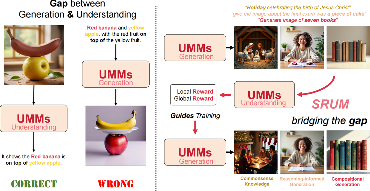 A post-training framework that creates a cost-effective, self-iterative optimization loop. SRUM compels a model's understanding component to enhance its generation component for better compositional, reasoning-informed and knowledge-informed generation.