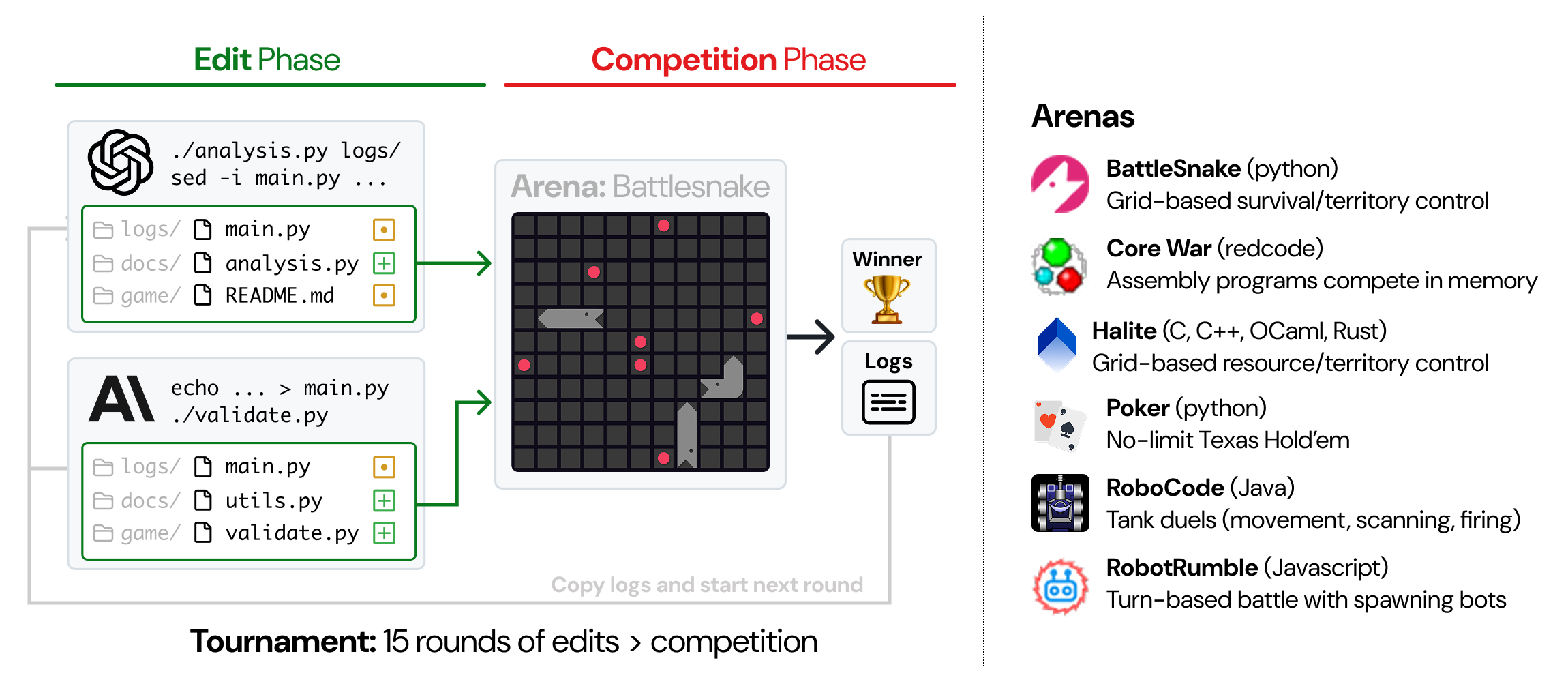 In CodeClash, 2+ models compete to build the best codebase for achieving a high level objective over the course of a multi-round tournament.