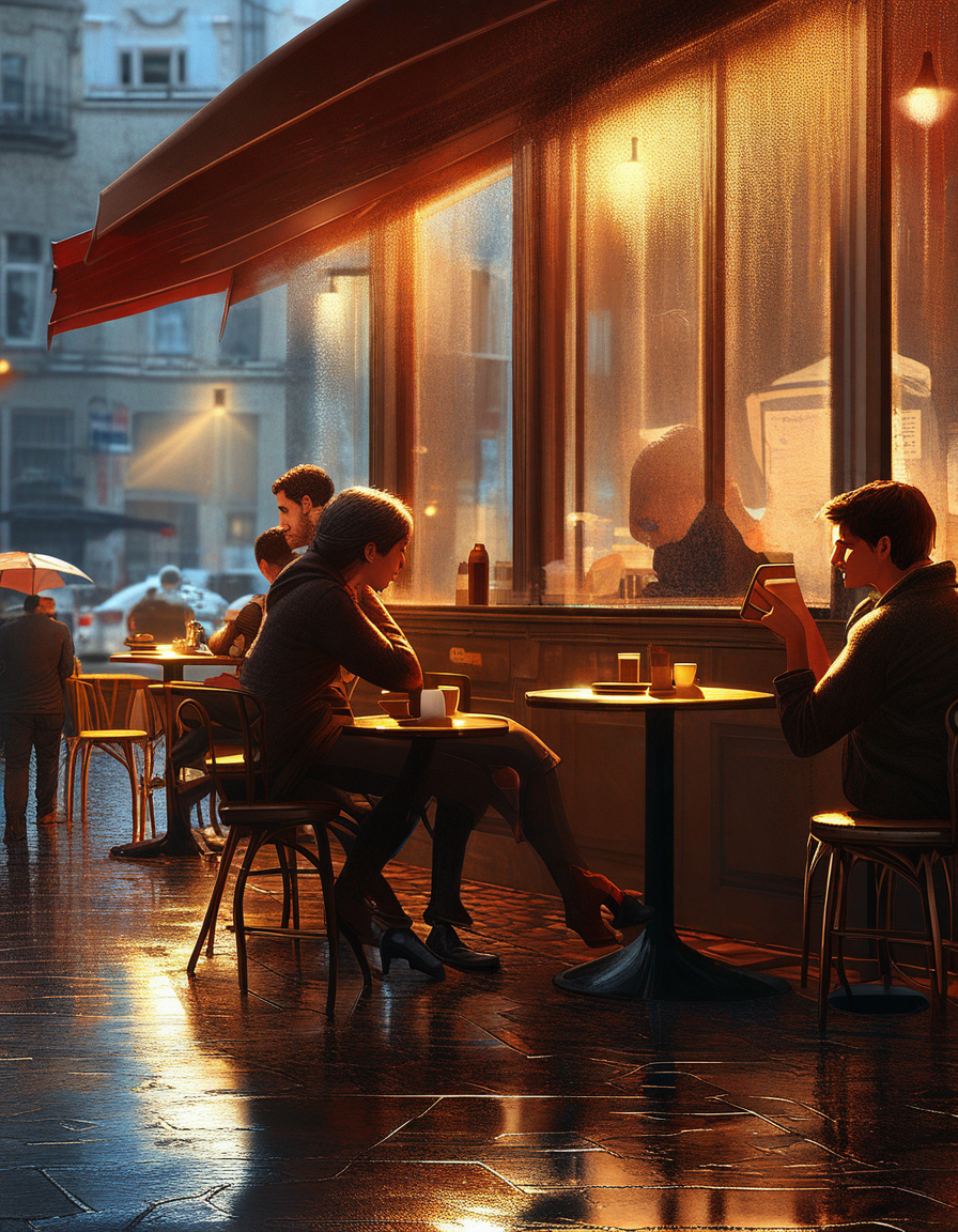 - Cozy cafe on a rainy day, people sipping coffee, warm lights, reflections on wet pavement, photorealistic